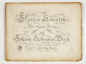 BACH, Johann Sebastian. Clavier Sonaten mit obligater Violine. . 2 volumes in-folio oblong (270 x 350 mm) de 25 pp . (partie violon) et (2)-95 pp . (partition), titres et musique gravés sur cuivre : cousus, plat supérieur de la couverture...