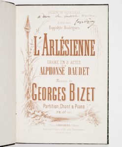 BIZET, Georges. L’Arlésienne. Drame en 3 actes de Alphonse Daudet... Partition pour le chant et le piano. Paris, Choudens, s.d. [1872]. In-4 de 85 pp. imprimées (catalogue des morceaux et musique) : demi-chagrin vert, dos lisse orné de filets et...