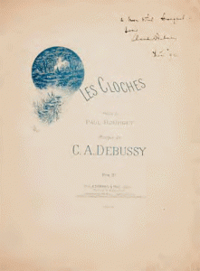 DEBUSSY, Claude. Les Cloches. Poésie de Paul Bourget. Musique de C. A. Debussy, Paris, Durand [Imp. E. Delanchy], s.d. [1891]. In folio (350 x 270 mm) de 3-(1) pp., titre lithographié et illustré en bleu, 2 pages de musique lithographiée (L....