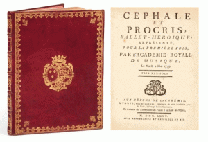 préface, liste des acteurs, chanteurs et danseurs, livret) : maroquin rouge, dos à nerfs, compartiments ornés de monogrammes fleurdelisés et couronnés, plats encadrés de dentelles, fleurs de lys aux angles, armes frappées au centre, gardes et contregardes de tabis framboise, gardes volantes d’origine, tranches dorées (reliure de l’époque).