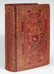 maroquin rouge entièrement recouvert d’un très riche décor doré à compartiments avec bordures végétales, fleurs de lys, angelots et fleurons aux petits fers, armes papales au centres des plats, dos lisse, gardes et contregardes de papier vergé, tranches dorées (reliure romaine de l’époque).