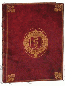 blanc) : maroquin rouge, dos muet à nerfs, compartiments ornés de fleurs de lys, trois filets encadrant les plats, grandes fleurs de lys aux angles, armes frappées au centre, gardes et contregardes de papier peigne, tranches dorées (reliure de l’époque).