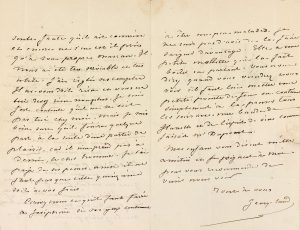 Curieuse lettre sur incident survenu à un valet d’écurie et sur les soins à donner aux chevaux. Elle renvoie au vicomte son serviteur Dupont « avec une vilaine tape à l’œil. Il ne peut nous dire comment la chose est arrivée, on l’a trouvé par terre dans l’écurie hier soir, avec la face tout en sang. Nous avons eu peur d’abord, et puis, après l’avoir lavé et pansé, nous avons vu que ce n’était pas grave et que c’était, comme on dit en Berry, la faute de son meilleur ami, le vin. Ne le grondez point. C’est la seule faute qu’il ait commise ». Il ne s’en est pris « qu’à son propre museau » ; elle est contente qu’il ne se soit pas tué chez elle, mais il risque de mal finir « à la suite d’une partie de plaisir, car il n’en prend pas à demi, le cher homme »… Elle demande ensuite des conseils pour sa jument Joséphine : « ses yeux continuent à être un peu malades. Je ne suis pas d’avis de la faire soigner davantage. Elle a une petite mollette ce qui la fait boiter en partant. Vous nous direz quand vous viendrez nous voir s’il faut lui mettre une petite pointe de feu ou continuer simplement à la panser tous les soirs avec une bande de flanelle et de l’esprit de vin comme faisait M. Dupont »...