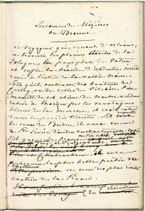 Beau manuscrit sur le Berry, l’élevage des chevaux et les courses hippiques de Mézières-en-Brenne, organisées par le comte de Lancosme-Brèves. Cet article paraîtra presque simultanément dans L’Éclaireur de l’Indre du 4 juillet et Le Constitutionnel (sous la rubrique « Journal d’agriculture ») du 6 juillet 1846, avec des variantes, sous le titre Le Cercle hippique de Mézières en Brenne par un habitant de la Vallée Noire ; il sera recueilli dans les Œuvres complètes illustrées (1851-1856) à la suite de Consuelo, puis en 1861 à la suite d’Isidora chez Michel Lévy frères. Le manuscrit, à l’encre brune, présente de nombreuses ratures et corrections. Sand commence par une belle évocation géographique de son Berry : « Le voyageur qui, venant d’Orléans, a traversé les plaines stériles de la Sologne, le pays plat de Vatan et enfin la brande d’Ardentes, s’arrête ravi à l’entrée de la Vallée Noire. Soit qu’il embrasse, des hauteurs de Corlay, ou de celles de Vilchère, l’immensité de cet abîme de sombre verdure relevé à l’horizon par les montagnes bleues de la Marche, il croit entrer dans le paradis terrestre »... Entre les belles vallées de l’Indre et de la Creuse, « s’étend un plateau uni, triste, malsain et pauvre, c’est la Brenne », contrée sauvage de bruyères et d’étangs, mais qui ne manque pas de charme, comme on peut le voir du haut du château du Bouchet. « Pour la vie de château, la Brenne est aussi une terre promise. Il y a là de riches manoirs, de vastes espaces à parcourir pour la chasse, ou à fertiliser par la culture en grand, du gibier en abondance, de gros revenus »… Avec l’engrais et l’irrigation, le sol devient « fertile et généreux », et les pauvres pourraient profiter de cette richesse. Sand en appelle aux devoirs des grands propriétaires, et dénonce la politique sociale d’un gouvernement de riches sans cœur. « Ce qui caractérise le Berry autant que la libéralité de sa noblesse en général, c’est l’indépendance et la générosité d’une notable partie de sa bourgeoisie démocratique », prête à faire le bien. Et elle cite l’exemple d’une « association de charité » dans sa ville de La Châtre. Ainsi les particuliers peuvent apporter bien des améliorations… Ainsi l’institution du Cercle hippique de Mézières. Sand retrace d’abord l’histoire de la Brenne : aux grandes étendues de forêts succédèrent des étangs qui décimèrent la population ; on commence heureusement à repeupler le pays et créer des ressources pour les paysans ; comme cette initiative du comte de Lancosme-Brèves, passionné de chevaux, en demandant « la création d’une école nationale d’agriculture et de haras » qui serait si utile pour « le salut de l’industrie chevaline en France », et pour la Brenne notamment, et pallierait l’incurie de l’État en ce domaine. Le comte a créé le Cercle hippique de la Brenne, « secondé par tous les habitans du pays, par les riches, par les nobles et par ceux qui ne sont riches que de dévouement et nobles que par le cœur ». Ses résultats dépassent les espérances : « l’élevage du cheval a été et doit être la principale ressource de la Brenne », pour « alléger la misère du petit cultivateur et créer une occupation fructueuse au prolétaire », en créant « une richesse agricole immédiate » par « l’élevage et l’amélioration de la race chevaline ». Reprenant les études de Lancosme-Brèves, Sand juge que la Brenne est le pays idéal à cet effet : « Ce n’est qu’en Brenne que nous pouvons espérer de nous remonter, en achetant des juments déjà croisées, et conservant encore dans leur sang le principe de cette forte race brandine qui s’allie si bien au sang arabe et encore mieux, pour l’usage, au percheron ». Le concours des poulains et juments de la Brenne a montré la beauté des chevaux issus de cet élevage, que Sand décrit en connaisseuse avant de raconter le déroulement des courses, qui attirent des foules où les aristocrates se mêlent aux paysans. Elle raconte notamment la course des cavarniers, c’est-à-dire les enfants qui soignent et élèvent les chevaux : « Pieds nus, tête nue, sans veste, le cavarnier galope sur le cheval nud. Il méprise la selle et les étriers », non sans danger : « Mais ce danger est une bonne nourriture pour l’homme, et j’aime qu’un paysan soit cavalier solide, et hardi. Il semble que cela le rende déjà libre et lle grandisse de toute l’énergie, de toute la fierté que l’air des champs devrait donner partout à l’enfant de la nature ». Aux courses rustiques succédaient des « courses fashionables », fort belles, « pleines de luxe, d’émotion, de force et d’adresse »…