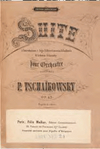 Tchaïkovski séjournait souvent à Paris. Le 16 août 1887, il rendit visite à son agent et distributeur français, l’éditeur Félix Meckar, et retira sans doute à cette occasion le présent exemplaire, qu’il offrit le jour même à Gabriel Fauré. Le compositeur français lui dédicaça en retour la partition de son second Quatuor avec piano. Il est intéressant de souligner que Tchaïkovski a offert à Fauré un exemplaire de la première édition de sa Suite alors que la deuxième avait déjà paru.