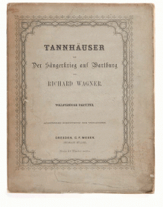 WAGNER, Richard. Tannhäuser und Der Sängerkrieg auf Wartburg (…) Vollständiger Partitur. Dresden, C.F. Meser, s.d. [1860]. In-folio (360 x 280 mm) de IV pp. (titre lithographié, dédicace à "Madame Camille Erard", liste des rôles et des...
