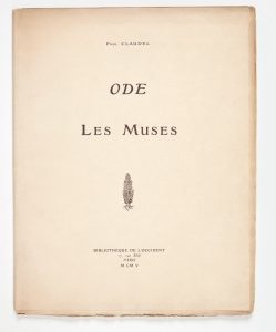 CLAUDEL, Paul. Ode. Les Muses. Paris, Bibliothèque de l'Occident, 1905. In-4 (330 x 260 mm) de (4)-31-(3) pp. : broché, couverture imprimée en noir, non rogné. →Édition originale. Tirage limité à 150 exemplaires sur Hollande Van Gelder...