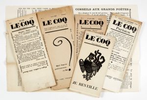[COCTEAU, Jean & RADIGUET, Raymond]. Le Coq. [À partir du n° 3:] Le Coq parisien. Revue. Gérant : Pierre Boyer. Paris, Imp. François Bernouard, 1920. 6 fascicules sous forme de placards pliés aux formats in-folio et in-4 (270 x 146 mm, 295 x...
