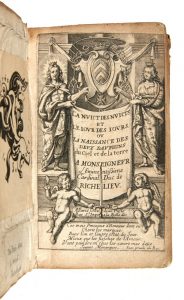 Elle est ornée d’un titre allégorique gravé sur cuivre dédié au cardinal de Richelieu. Le recto du dernier feuillet porte les armes royales gravées sur bois ; le verso est blanc.