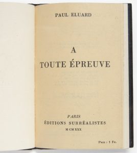 ÉLUARD, Paul.À toute épreuve. Paris, Editions Surréalistes [Imp. Ducros et Colas], 1930. In-16 (108 x 72 mm) de (16) pp. : veau noir, dos lisse avec titre au palladium en italiques, plats recouverts d'une feuille de papier argenté traité à...