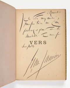 JAMMES, Francis. Vers. Paris, Librairie Paul Ollendorff, 1894. In-12 (18 x 135 mm) de (4)-92 pp. : maroquin vert, dos à faux-nerfs, trois filets encadrant les plats, initiales E.R. frapppées sur le premier plat, dentelle intérieure, couverture...