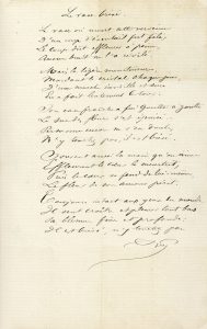 Beau recueil de quinze des plus célèbres poèmes de Sully-Prudhomme. Le Vase brisé (5 quatrains), signé « SP » : « Le vase où meurt cette verveine D’un coup d’éventail fut fêlé »... Mars (8 quatrains) : « En Mars, quand s’achève l’hiver »... Les Exils (6 quatrains), signé « Sully Prudhomme » : « Plaignez les exilés qui laissent derrière eux L’amour et la beauté d’une amante chérie »... Le Volubilis (4 sizains), signé « Sully Prudhomme », daté « Septbre 69 » : « Toi qui m’entends parler, sans frayeur, de la mort »... Fleurs de sang (8 quatrains), signé « SP » : « Changeant leur toilette fanée Les jardins s’habillent de frais »... La Sourde-muette, Sonnet, signé « SP », avec correction : « Je ne souhaite plus qu’une esclave au beau corps, Sans ouïe et sans voix, pour toute bien aimée »... Si vous saviez, Romance (4 quatrains), signé « SP » : « Si vous saviez ce qu’on désire Quand on est seul et sans foyers »... Le Rendez-vous (32 quatrains), avec corrections : « Dans ce coin furtif, où nous sommes, Ô ma chère âme, seuls tous les deux »... À Théophile Gautier (sonnet), signé « Sully Prudhomme » : « Maître, qui du grand art levant le pur flambeau »... La Coupe d’or (sonnet), signé « Sully Prudhomme » : « Dans les verres épais du cabaret brutal Le vin bleu sans relâche à peu de frais abonde »... Avril (10 quatrains), signé « SP » : « J’ai peur d’Avril, je crains l’émoi Qu’éveille sa douceur touchante »... Juin, Sonnet, signé « SP » : « Pendant Avril et Mai qui sont les plus doux mois »... Le Ciel des cœurs (13 quatrains), avec corrections : « Si tous les astres, o Nature, Trompant ta main qui les conduit »… »... Dans les Pyrénées (sonnet), signé « SP » : « La Cascade sauvage, avec son gros murmure »... La Pudeur, Sonnet, signé « SP » : « Dans l’œil désert et froid des vierges, ô Nature, Tu fis bien d’allumer un céleste flambeau »... Ancienne collection Louis Barthou (n° 1097, qui annonce par erreur 13 poèmes, n’ayant pas pris en compte les poèmes écrits au verso).