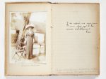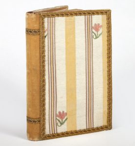 recouvert de soie crème imprimée de rayures verticales or et prune, deux petites fleurs brodées de fil rouge et vert sur chaque plat, galon de fils dorés encadrant les plats, dos muet de velours beige orné verticalement de deux galons dorés, doublure de soie bouton-d'or, gardes de papier avec décor végétal rose et or, tranches dorées (reliure de l'époque réalisée par Geneviève Mallarmé) ; préservé dans une boîte moderne de chagrin noir doublée de velours vert mousse.