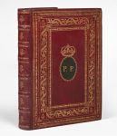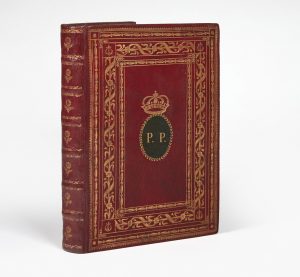 Russie rouge, dos à six nerfs sertis de guirlandes, fleurons dans les entrenerfs ; sur les plats : riche décor de filets, chaînettes et guirlandes avec petites lyres dans les angles, encadrant une couronne princière et une pièce ovale mosaïquée de maroquin vert sertie d'une couronne de laurier et frappée des initiales "P.P." ; bordure intérieure rehaussée d'une roulette, doublure et gardes de soie verte, tranches dorées et ciselées (reliure italienne de la fin du XVIIIe siècle).