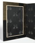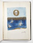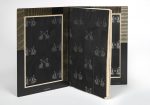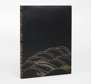inférieure du premier plat est ornée d'un décor maritime stylisé à l'extrême combinant filets courbes dorés, au palladium et à froid ; bordure intérieure rehaussée de filets dorés ou à froid, horizontaux ou verticaux, débordant sur les coupes ; doublure et gardes de soie noire brochée de motifs argentés (voiliers et dauphins baroquisants), contregardes de papier argenté, couverture et dos conservés, non rogné, tranches au palladium sur témoins, étui bordé (A. & J. Langrand 1925).