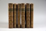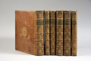 Six volumes in-4°, plein veau blond, triple filet doré encadrant les plats, armes dorées au centre, dos à nerfs orné d'un fer héraldique répété, filet doré courant sur les coupes, frise dorée intérieure.