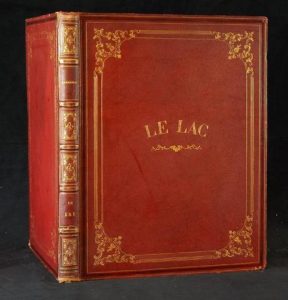 LAMARTINE (Alphonse de) - Le Lac. P., Curmer 1860, in-folio (47 x 35 cm.) rel. demi-chagrin rouge (frottis, coiffes usées), plats de percale dito titré or au centre, illustré de 16 eaux-fortes tirées sur Chine par Alexandre de BAR.
