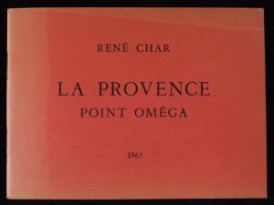 CHAR René - LA PROVENCE POINT OMEGA. S.l. (Imprimerie de l'Union pour l'Auteur) 1965, ► rare plaquette in-16 oblong (15,4 11,4 cm.) agrafée, couv. imp. rouge légèrement insolée.