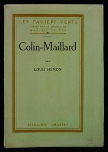 HÉMON Louis - Colin-Maillard. P., Grasset "Cahiers Verts" 1924, in-12 broché à grandes marges. Édition originale, un des 40 ex. num. sur papier Vert Lumière (n° xxxv). Bel ex..