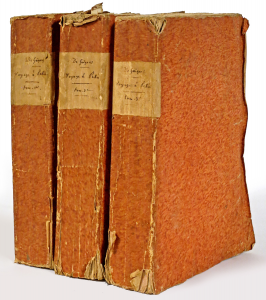 GUIGNES, Chrétien-Louis-Joseph de.- Voyages à Peking, Manille et l’Île de France, faits dans l’intervalle des années 1784 à 1801. Paris, Imprimerie impériale, 1808. 3 vol. in-8° (n.c., incomplet de l'atlas, pet. rouss., qqs pp. lég....