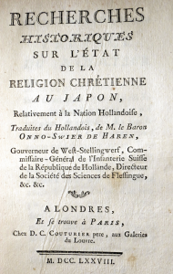 VAN HAREN, Onno Zwier.- Recherches historiques sur l’état de la religion chrétienne au Japon, relativement à la nation hollandoise […]. À Londres et se trouve à Paris, D.C. Couturier père, 1778. In-8° (n.c.).