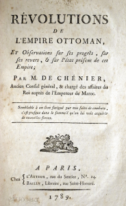 CHÉNIER, Louis de.- Révolutions de l’empire ottoman, et observations sur ses progrès, sur ses revers, & sur l’état présent de cet empire […]. A Paris, chez l'Auteur [et chez] Bailly, 1789. In-8° : [4]-xl-388 pp. (piqûres, salissures aux...