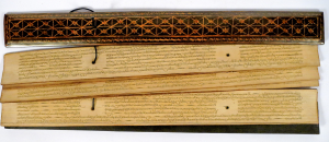 Reliure "accordéon de l'époque : feuillets liés par un cordon à 2 ais de bois laqué ornés d'un décor géométrique et floral.