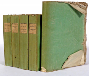 Brochage de l'époque, sous couv. muettes de papier vert (dos lég. brunis et plat sup. du t. 4 part. bruni, bords pliés).