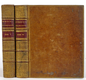ALVAREZ de COLMENAR, Juan.- Annales d’Espagne et de Portugal […]. Amsterdam, François L'Honoré & fils, 1741. 4 tomes en 2 vol. in-4° : [4]-xii-424-[2], [4]-288, [4]-331, [4]-340-[44] pp.; 85 h.-t. (rouss. concentrées, qqs pp. lég. brunies,...
