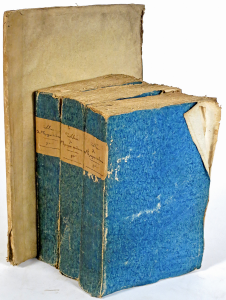 Brochage de l'époque, sous couv. muette de papier marbré bleu (jaune pour l'Atlas), étiq. mss sur les dos lisses (plats frottés, qqs coins pliés, qqs pet. manques).
