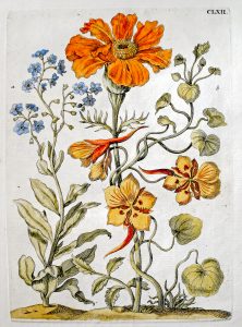 EERSTE FOLIO-UITGAVE van de Nederlandse vertaling van Merian's "Der Raupen wunderbare Verwandelung und sonderbare Blumennahrung" (1ste uitg. 1679), waarbij de insecten in de verschillende stadia van hun metamorfose op en rond diverse bloemen worden voorgesteld. Maria Sybilla (1647-1717), dochter van de graveur Matthias Merian, was bekend om haar vroege observaties van Surinaamse insecten. Jean Marret, de auteur van de Franse vertaling, heeft het oorspronkelijke werk uitgebreid met de commentaren bij 18 nieuwe verschenen platen. De Joannes Oosterwyk, de auteur van de Nederlandse vertaling, voegde de platen "I" en "LI" toe en droeg het werk op aan Balthazar Scott, schepen van Amsterdam, baljuw en dijkgraaf.