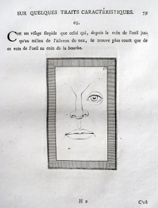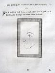Leipzig, 1775-1778) paru tardivement suite aux troubles révolutionnaires et distribué gratuitement aux souscripteurs des "Essais" ou vendu à part. Les pp. 83-92 sont consacrées à un essai intitulé "Sur les lignes d'animalité" (complet ? il faut peut-être 3 h.-t. pour cette section) et l'ensemble est illustré de 56 vignettes gravées in texto figurant fronts, yeux, bouches, etc., sauf la dernière qui figure un portrait (probablement de l'auteur), la physiognomonie ayant pour objet la connaissance du caractère d'après la physionomie ou certaines expressions du corps.
