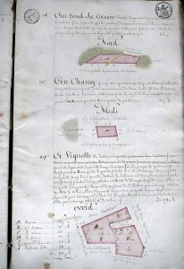 Relevé détaillé de terrains dépendant d'une ferme sise à Chouy, dans l'Aisne, localité proche de Neuilly-Saint-Front où réside le commanditaire, "propriétaire de fonds". Illustré de plans aquarellés de rouge, vert et jaune.