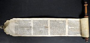 MANUSCRIT RELIGIEUX (thorah ?). Sur peau de vélin, 233 x 16 cm (assemblage de plusieurs parties cousues entre elles), monté autour d'un bâton de bois.