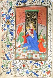 BOOK OF HOURS, in Latin, for the use of Utrecht (?), illuminated on vellum. [ Bruges, c. 1450]. In-8° (15 x 11,8 cm) : 72-[1] lvs (decorated lvs slightly cropped at the top or at the bottom, Crucifixion damaged by water, slightly used).
