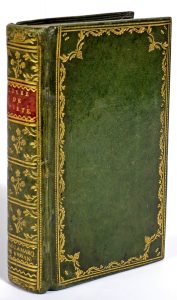 Rel. fin 18e-début 19e s. (?) : plein chagrin vert, plats sertis de filets, roulettes et fleurons dorés, dos lisse à caissons richement fleuronnés dorés et étiq. de cuir vert, roul. fleuronnée et filets pleins ou pointillés dorés sur les coupes et remplis, gardes de papier pochoir, tranches dorées.