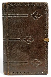 Rel. souple de l'époque : plein veau, décor à froid d'inspiration médiévale, gardes de papier dominoté (renouvelées).