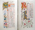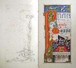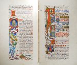 Chaque page enluminée en or et couleurs à la façon des manuscrits médiévaux (lettrines ornées, baguettes, rubrications, capitales rubriquées ornées dorées, bordures, antennes....).