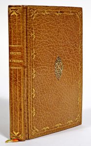 Rel. de l'époque : bradel plein maroquin lavallière, filets et roul. fleuronnée cernant les plats avec monogramme central "S.D." en métal posé sur le plat sup., dos lisse orné de filets dorés en long, tr. dorées, filets et large roul. fleuronnée dorés sur les coupes et remplis cernant des doublures en reps moiré mastic, gardes de même reps.