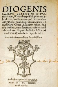DIOGENES LAERTIUS.- De vita, & moribus philosophorum libri decem, novissime iam post o[mn]es omnium castigationes nova diligentia emendati, ad exemplaria Graeca diligenter collati […]. [ Köln], Eucharius Agrippinas excudebat, 1535 mense Martio....