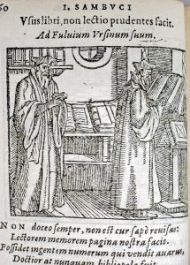 SAMBUCUS, Joannes.- Emblemata, et aliquot nummi antiqui operis […]. Antverpiae [i.e. Leiden], apud Christophorum Plantinum, 1584. in-16° : 352 pp. (pp. 231-232 lacking, cut close to the text, lack of paper with minor loss of text on leaf P5).