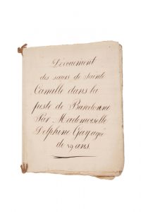 Delphine de GIRARDIN née GAY (1804-1855). Dévouement des sœurs de Sainte Camille dans la peste de Barcelonne par Mademoiselle Delphine Gay agée de 19 ans. Manuscrit contemporain (autographe ?) d’un poème de jeunesse de Delphine GAY présenté...