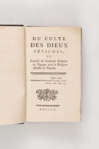 BROSSES (Charles de) - Du Culte des Dieux fétiches ou Parallèle de l'ancienne Religion de l'Egypte avec la religion actuelle de la Nigritie. S.l., s.e., [Genève, Cramer] 1760. In-12 (9,5x16cm) 285p. Demi-basane postérieure, dos lisse orné.