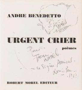 André BENEDETTO (André) – PONS (Lous)- Urgent crier, poèmes. Forcalquier, Robert Morel, 1966. In-8 (14x15cm) 109p.