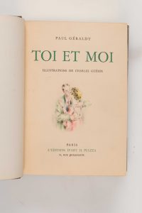 GERALDY (Paul) – [GUERIN] – Toi et Moi. Paris, L’Édition d’Art H. Piazza, 1932. In-8 (13,5x19,5cm) 174p. Plein maroquin, dos à nerfs, Tête dorée, couverture conservée. Reliure signée R. Degoul.