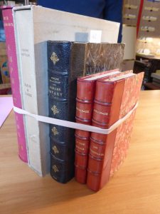 originale ; ex. num. sur Arches MALRAUX: La Voie Royale. Paris, Grasset, 1930 ; in-12 demi bas. rouge, conv. Cons., éd. originale ; ex. num. sur Alpha. GIRAUDOUX: Amphitryon 38. Paris, Ed. du Bélier, 1931; in-4° plein chagrin violet, titre frappé en long sur le dos, tête dorée, couv. cons. étui. Ed. ill. par Mariano Andreu; ex. num. sur Lana. FLAUBERT: Madame Bovary. Paris, Quantin, 1885 ; in-8, demi mar. noir, tête dorée ; éd. ill. par Fourié