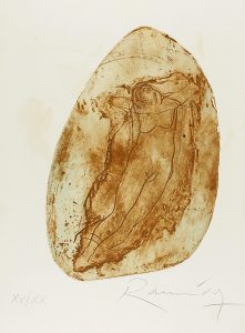 (LIBRO-OBJETO) - 1960 - RAMIREZ, VICTOR [texto] ; GARCIA, CONCHA [artista] : ANAGRAMA DEL ACOSO HUMEDO. Barcelona : Ed. Galeria ; Edicions Aixa, 1987. Folio menor. 8 p. en acordeón. Grueso papel de hilo con barbas.
