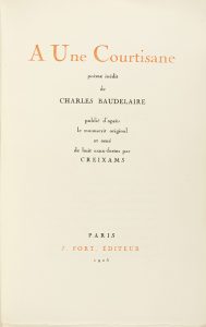 (BIBLIOFILIA-EROTICA) - 1925 - BAUDELAIRE, CHARLES : A UNE COURTISANE POEME INEDITE. Publié d´après le manuscrit original et orné de huit eaux-fortes para CREIXAMS. Paris : J. Fort, edit. , 1925. 4º. 18 h.