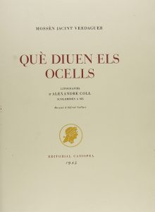 (BIBLIOFILIA) - 1945 - VERDAGUER, JACINT : QUÈ DIUEN ELS OCELLS. Litografies d´Alexandre Coll acolorides a mà. Revisió d´Alfred Gallart. Barcelona : Editorial Casiopea, 1945. Folio. III + 162 p. , 2 h. , 16 litografías en color, viñetas...
