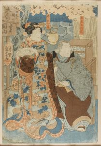 (GRABADO JAPONES) - 1840 ca - UTAGAWA, KUNIYOSHI? : CEREMONIA DEL TE?. Xilografía a color sobre papel de arroz. 37 x 24,5 cm. Margen inferior izquierdo con el color levemente desvanecido. 1840 ca.
